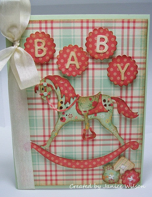 1. Un suaje de cigueña que trae cigueñas,circulo, circulo de escalopa, caja y letras para formar palabras que dicen GIRL , BOY, BABY