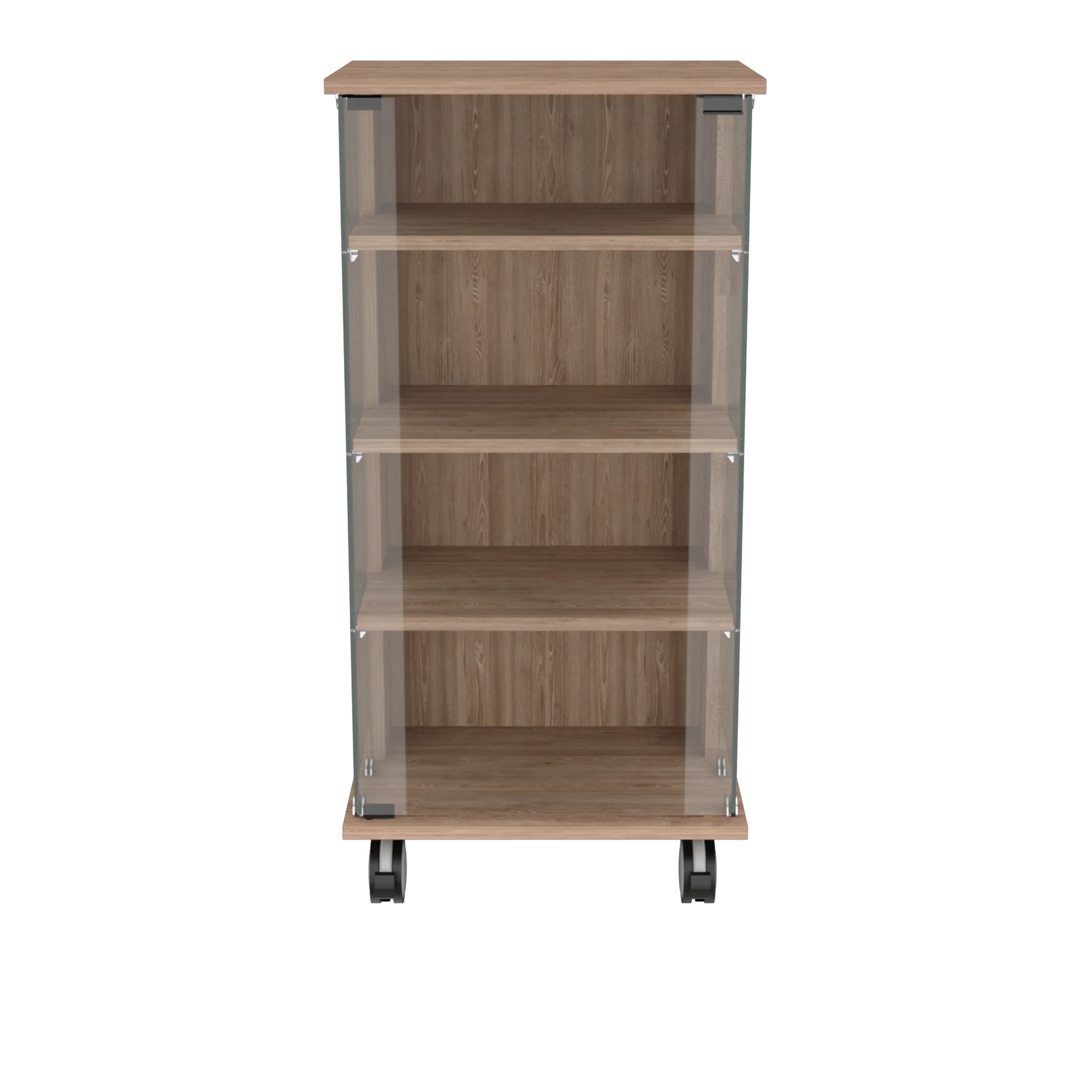 Vitrina, con 1 puerta de vidrio, 3 entrepaños, y rodachines para su fácil desplazamiento.